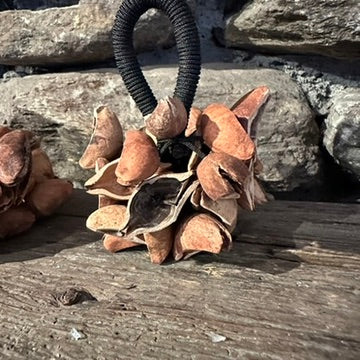 The bush rattle is very much that…it is meant to mimic small animals though low bushes. Think of a chipmunk running through dry leaves…and you have this rattle One rattle has smaller seeds providing a higher pitch while the other uses larger seeds. When played together you can hear a wide range of pitch…which is a nice feature for rattles as it is not too common