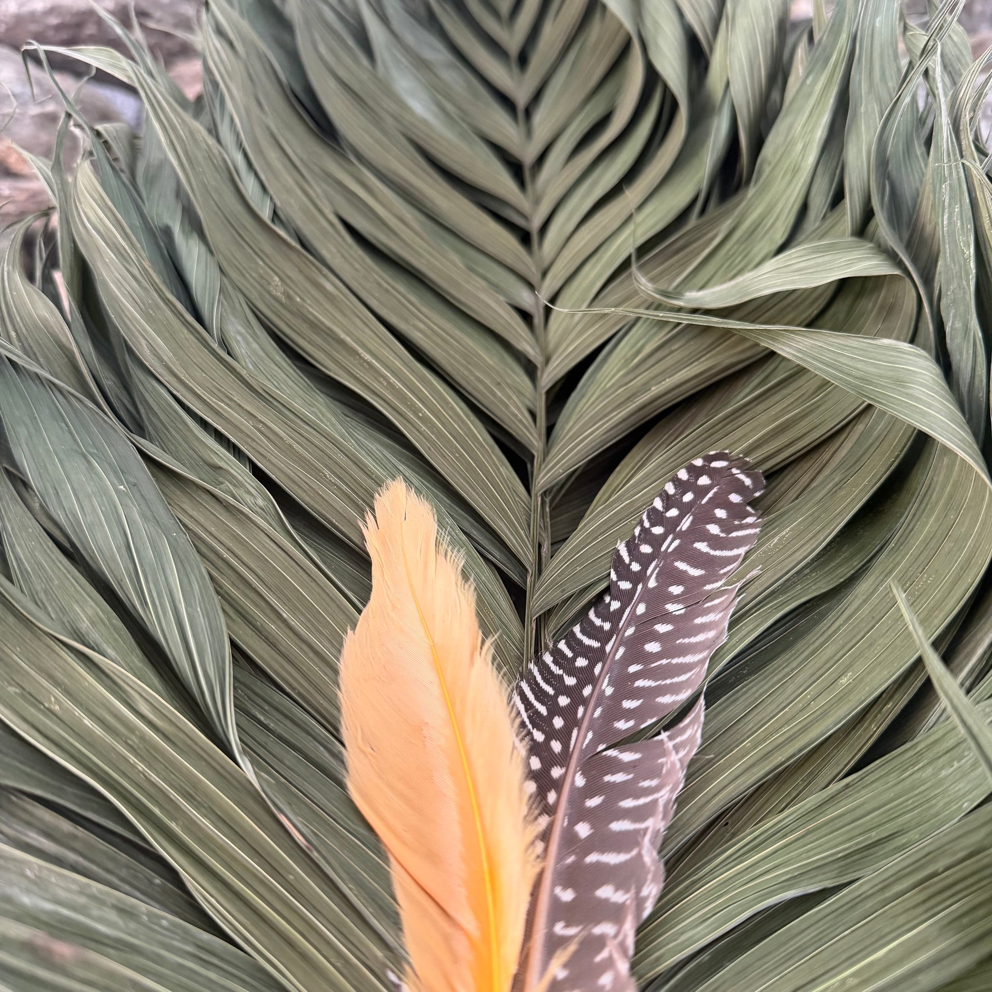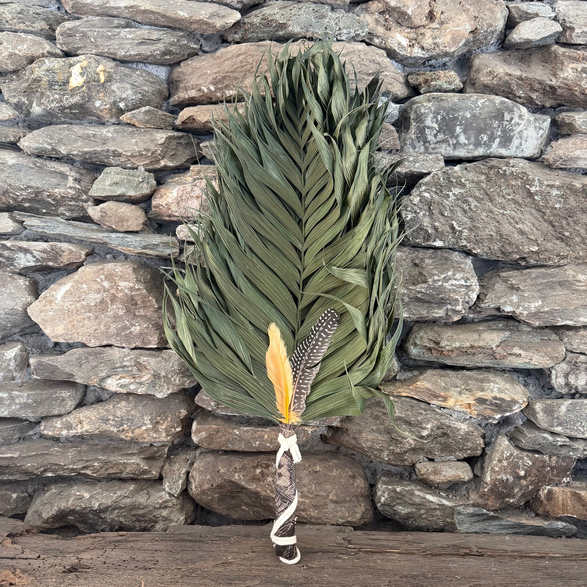 A ceremonial chakapa honoring the Commodore Palm's profound symbolism of resilience and human flourishing. This 25" instrument combines the palm's transformative essence with intentionally chosen feathers: Guinea plumage for protective grounding energy, and goose feathers to strengthen ancestral spiritual bonds. The warm brown and tan fabric with cream cord creates an aesthetically refined tool suitable for serious shamanic and healing practitioners.