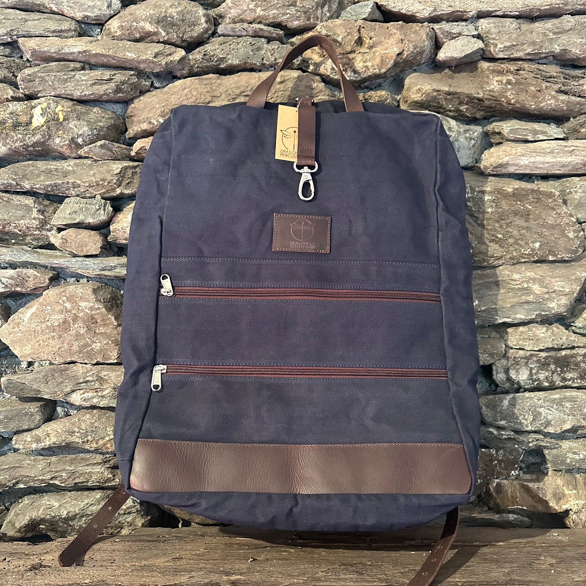 The Dragonfly stick bag, redesigned for professional sound practitioners, combines durability with refined aesthetics through its waxed cotton canvas and leather exterior. It offers two spacious utility pockets and a large compartment that fits full-size orchestra folders. A convenient clip strap secures small accessories like tambourines. Adjustable, padded backpack straps ensure ergonomic comfort. Inside, heavy-duty nylon canvas features 32 narrow, 8 large, and 6 micro triangle-beater pockets, providing organized storage for a vast array of mallets. This design allows quick, quiet access to any stick during rehearsals or auditions, enhancing efficiency and professionalism.