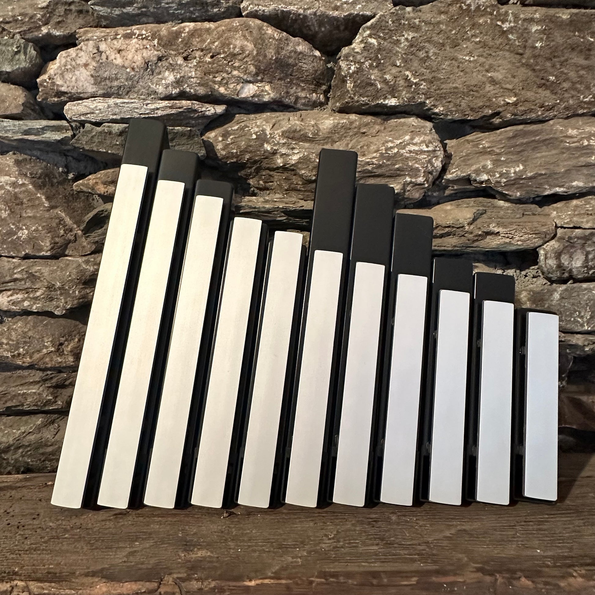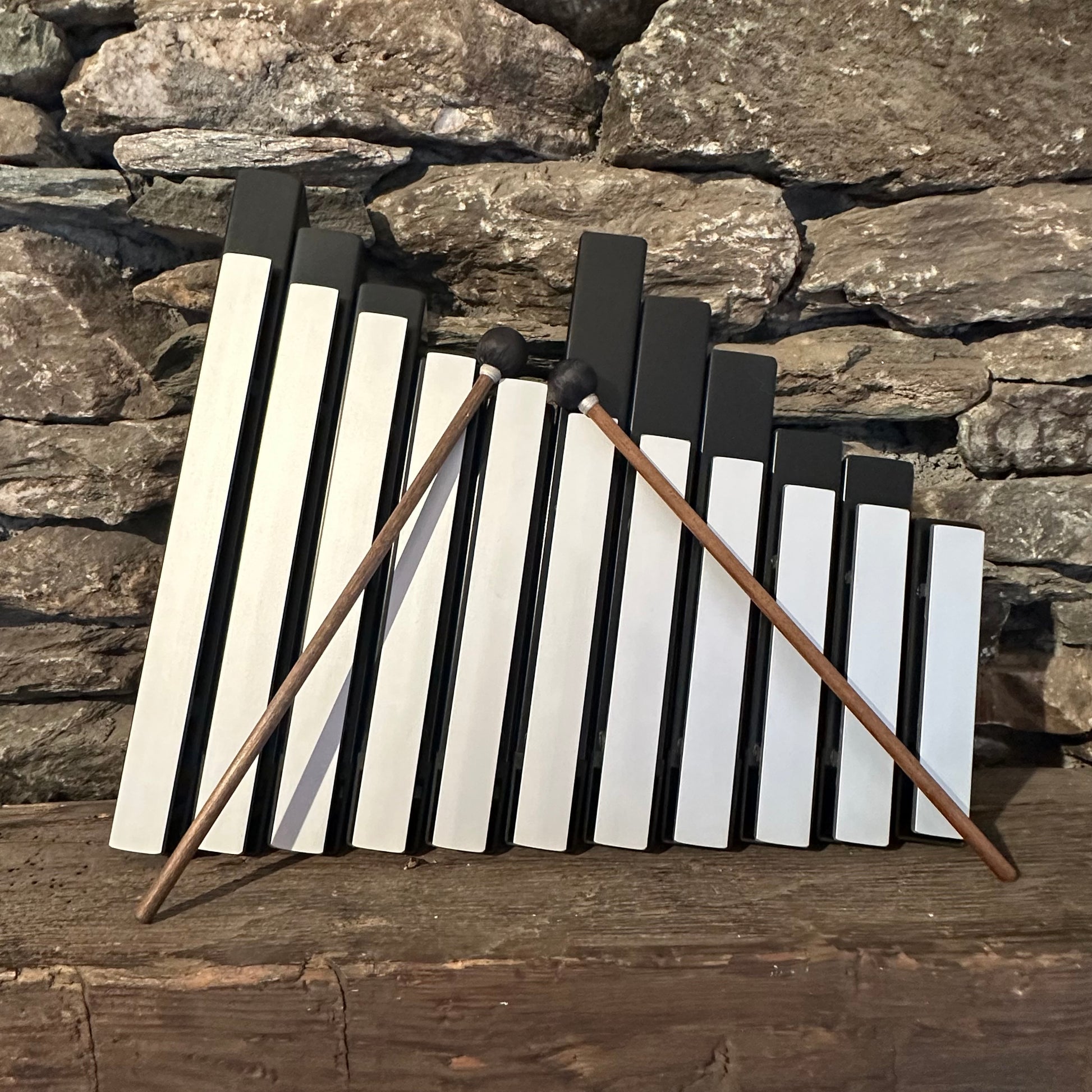 This instrument features 11 aluminum bars, each 1” wide, covering two octaves (C-D-E-G-A-C-D-E-G-A-C). Weighing 4 pounds, it measures 14.5” x 17” x 5” and comes complete with two Wing Mallets.