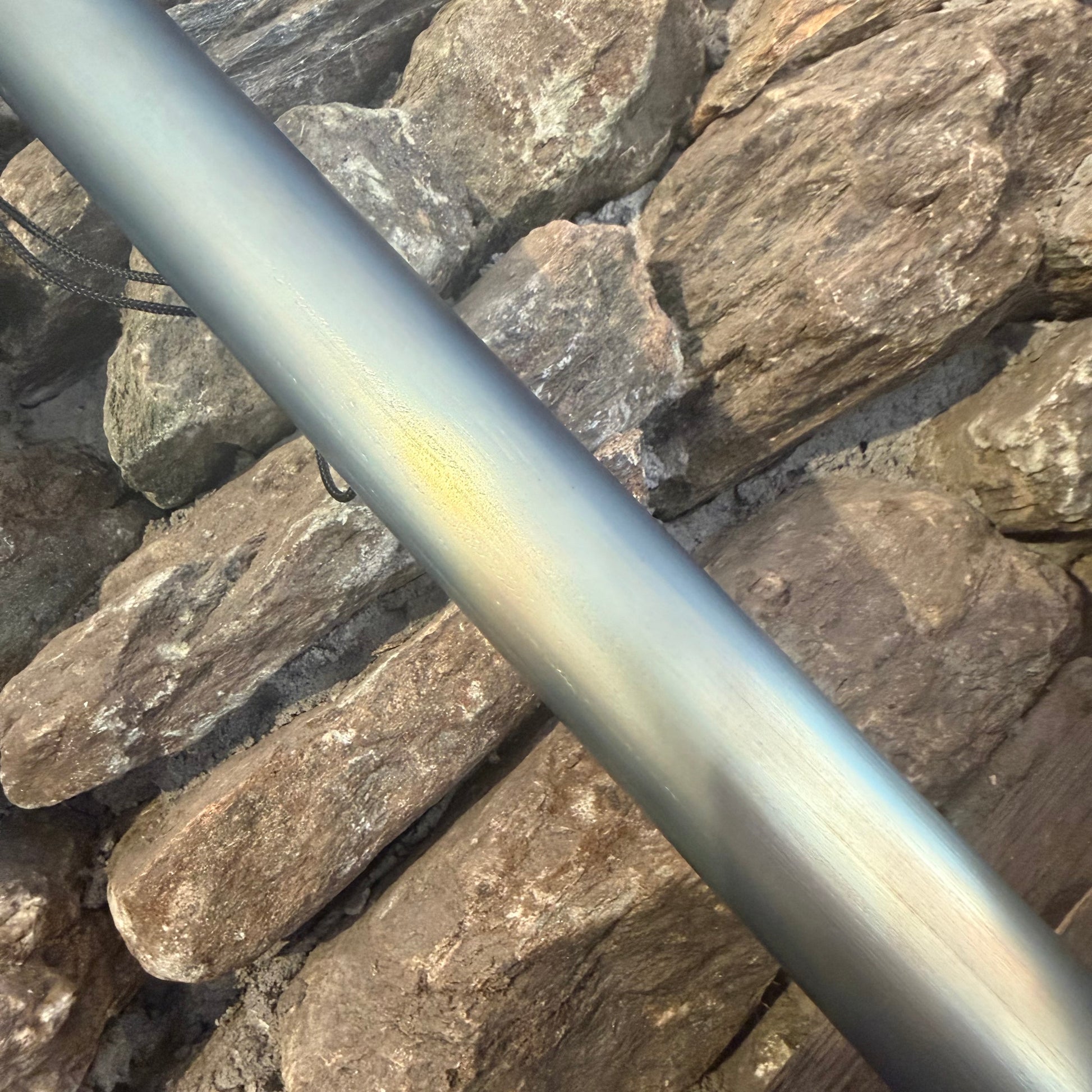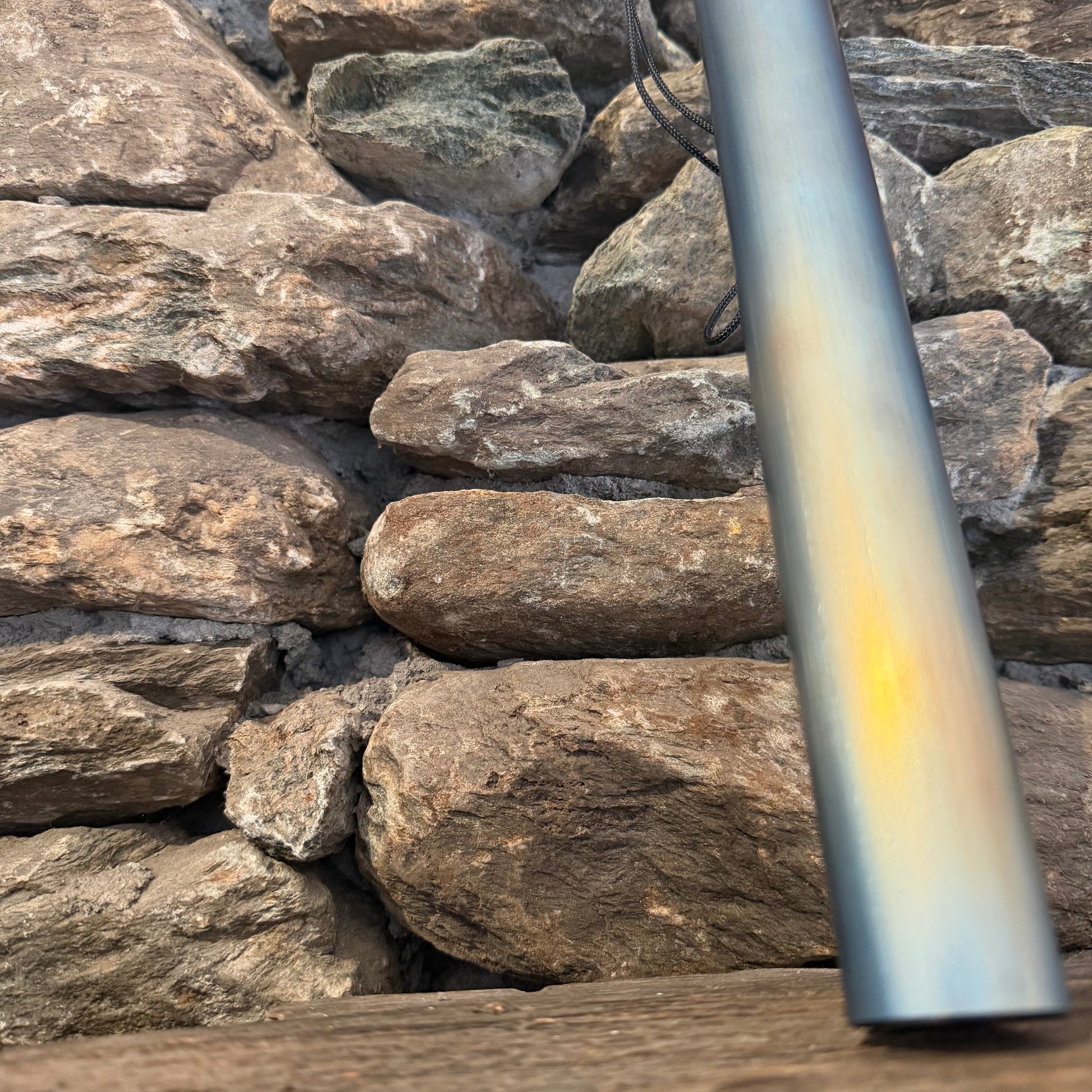 The extraordinary sound properties of these tubular bells of titanium are a result of the element being the only metal with a hexagonal crystalline structure. Fire treatment also creates a rainbow-colored surface. Accessories include handle and mallets. Excellent for earth-acupuncture. Titanium's hexagonal crystalline structure and fire treatment create a unique sound unlike any other metal. The rainbow-colored surface and included handle and mallets make these tubular bells perfect for therapeutic sound healing and acoustic massage.