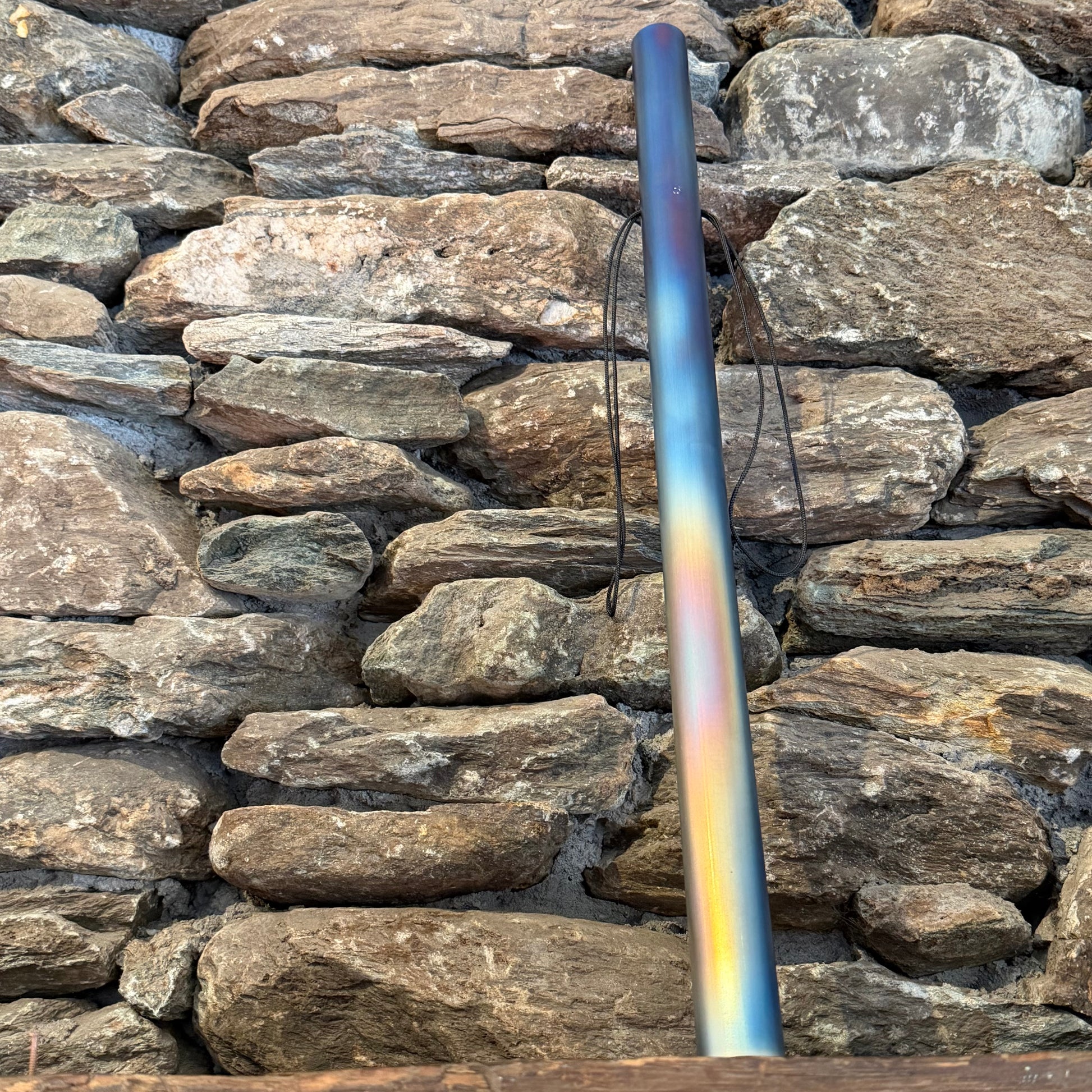The extraordinary sound properties of these tubular bells of titanium are a result of the element being the only metal with a hexagonal crystalline structure. Fire treatment also creates a rainbow-colored surface. Accessories include handle and mallets. Excellent for earth-acupuncture. Titanium's hexagonal crystalline structure and fire treatment create a unique sound unlike any other metal. The rainbow-colored surface and included handle and mallets make these tubular bells perfect for therapeutic sound healing and acoustic massage.